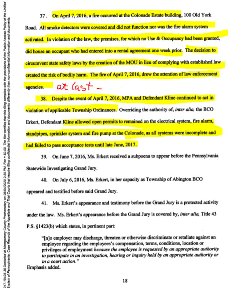 A class action suit was  filed on behalf of the tenants  in November 2015 .  That was mishandled and ultimately failed .   But the citizens of Abington -- all its citizens ----- will also be paying through the nose for all of the actions that were required at this property  and those that as of September 2020 are STILL underway.   The actions included among the many legal actions, even a 5 million dollar lawsuit  and many smaller ones.  Filed in some cases, against the Township supposedly in a struggle to maintain that sprinklers would not be needed --- but frankly my personal opinion was that many were filed as a diversion to side step questions and investigation into these practices.