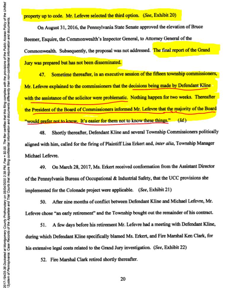 The entire process and the story told in the documents of the renovations, is one that everyone should read for themselves,  There is little more that can be said except that I, in my own humble opinion, having read a majority of the documents in the massive volume that exists in this case, have on going concerns for what the future of this property may be and for what the future of the Township may be - given that the Solicitor and Commissioners and so many of the bad actors are still in their roles ---- or have been elevated to higher positions in government service.  Steve Kline is head of the Planning Commission at Montgomery County and is fine letting Township Planners who should be holding developers to the laws, instead help the developers write ordinances that violate laws as at the Willow Grove Mall in 2021 -- and the Assistant Fire Marshall was elevated to Fire Marshal where, again in 2021 , he just OK'ed the Baederwood 244 units that did not meet code and were designed, somehow, astoundingly, with an entire side that is unreachable by emergency6 vehicles  so that the developer could squeeze in a few more units.  So because there were no consequences, there is more of the same thing going on  in Abington.