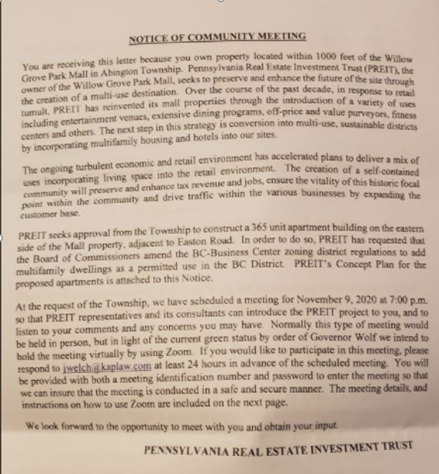 WILLOW GROVE MALL AND ADJACENT LAND HAS APARTMENT DEVELOPMENT IN ITS